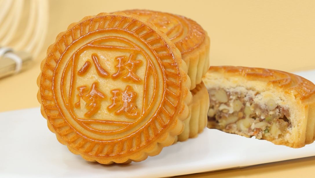 主料:八珍玫瑰馅(含核桃仁、芝麻仁、花生仁、重瓣红玫瑰、榛子仁、腰果仁、夏威夷果仁、西瓜籽仁、松仁)、小麦粉、糖浆、植物油