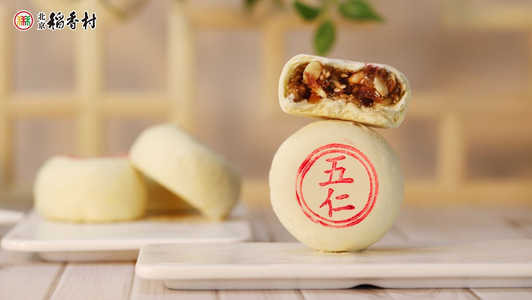 主料:五仁馅(含核桃仁、芝麻仁、松仁、南瓜籽仁、西瓜籽仁)、小麦粉、白砂糖
